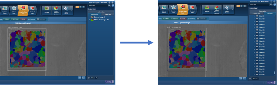Screen grab from AZtec showing a single map set up in 2D, then automatically repeated on multiple slices to create 442 EBSD maps for a 3D reconstruction.