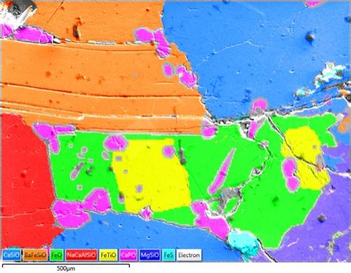 Or looking at the data another way, here are the identified phases displayed on an electron image of the area.