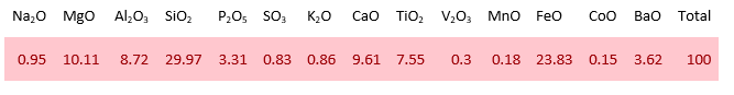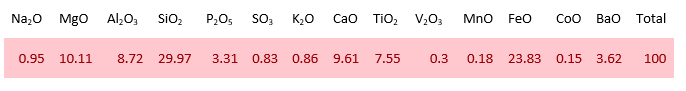 Using the traditional method and collecting a spectrum, the composition of this area (in oxide %) is: