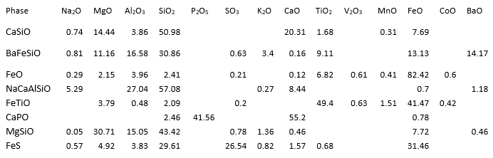 If we compare the two results, we can see that we have a similar result, but one that is different in detail. In general, the AutoPhaseMap method predicts lower concentrations for lighter elements and higher concentrations for heavier elements. For example, the level of P2O5 calculated by our proposed approach is almost halved compared to the traditional method, and the level of FeO is nearly 6 wt% more.