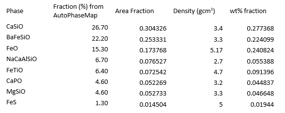 Next we have to correct for the amount of each phase, by determining the wt% of each phase in the area. This is determined from its area % (as calculated from AutoPhaseMap) and the density of each phase (taken from webmineral.com).