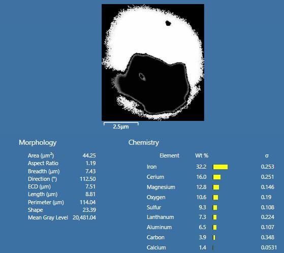 It is difficult to automatically analyse these complex inclusions, because these complex inclusions have multiple parts with very different contrast in the back scattered electron (BSE) image and cannot be detected as a whole automatically using the conventional approach of thresholding on desired phases. This results in errors in both morphology and chemical composition measurements, and thus could mislead the evaluation on the effect of RE elements additions. An example of a BSE image of a complex inclusion is shown in Figure 1.