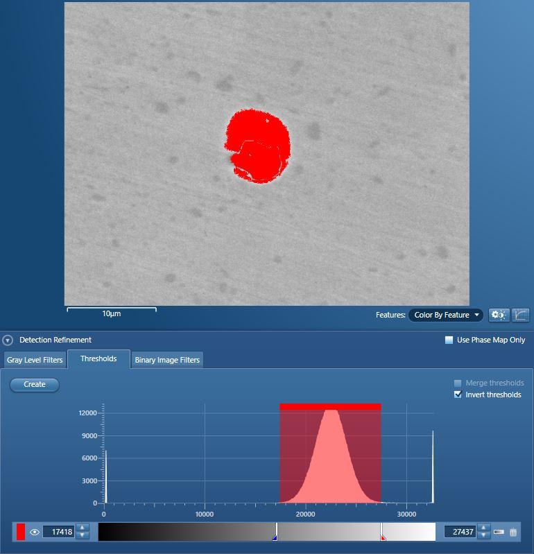 In the latest AZtecSteel, the automated inclusion analysis platform, it is possible to detect an inclusion that contains multiple phases, some of which are lighter than the matrix and some of which are darker, as a single inclusion. In order to do this, we have implemented a functionality that allows the part of the grey level range that should not be thresholded to be selected – so that the rest is thresholded (Figure 2a). Morphology and composition can, therefore, be correctly measured as a whole (Figure 2b & 2c).