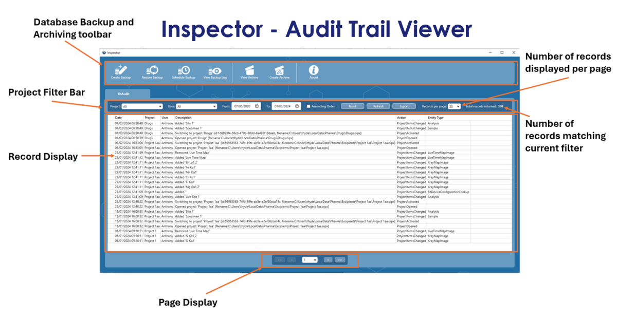 User login functionality is crucial to the whole process, because knowing who is using the software means that we can record and stamp all major data interactions with the username, date and time, which in turn generates an “Audit Trail”. Obviously, for this to work, the user created SOP needs to state that all users must not share their login details and not leave the system unattended and logged in. Then, we have the requirement to view this audit trail. The most straightforward way of achieving this was to create a dedicated viewer, which we called “Inspector.” This program not only enables the user to view the records, but also allows the user to filter records based on the username, project name, time and date. It’s not enough to be able to view the audit trail, because users often have strict backup and archiving procedures. So, the Inspector program enables the user to setup regular Backups, as well as Archiving portions or all of the database, based on date. The archived database can then be viewed at a later date, within the same Inspector program.