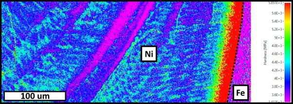 Map showing hardness variations across a typical weld interface between the low alloy steel (far right edge of the map) and the Ni alloy. Note the high hardness values adjacent to the interface. Image courtesy of FemtoTools. Image courtesy of FemtoTools AG.