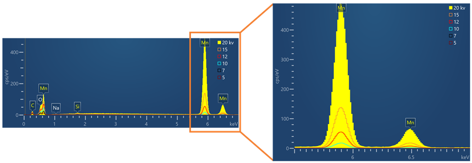 El sobrevoltaje es el voltaje mínimo de aceleración requerido para excitar una línea dada para un elemento. Goldstein et al. han definido una sobretensión apropiada como E_0/E_c >1.5 , donde E_0 es el voltaje de aceleración y E_c la energía de la línea de interés. La Figura 2 muestra un ejemplo de este fenómeno. Digamos que estamos interesados en el pico Mn Kα. A medida que el voltaje disminuye, el pico se hace más pequeño. A 10 kV hay un pico notable, pero a 7kV ya no se puede distinguir el pico versus el fondo. Si el usuario está buscando una línea de un elemento específico, el sobrevoltaje debe tenerse en cuenta al seleccionar el voltaje de aceleración para el experimento.