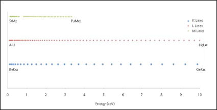 A medida que disminuimos el voltaje, se deben utilizar las líneas L, M y N para el análisis y la cuantificación (L en este ejemplo de Mn). Esto trae a colación otro aspecto que es la superposición de picos. Analizando la distribución de las líneas para la mayoría de los elementos (que se muestra en la Figura 3) a medida que el voltaje disminuye, hay más líneas con menos separación entre ellas. Esto significa que, si varios elementos están presentes en la muestra, hay una mayor probabilidad de obtener picos superpuestos en el espectro. La superposición hará que la identificación de elementos específicos sea más compleja para la identificación automática.