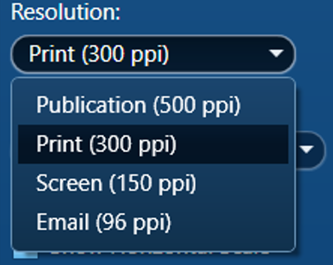 Choose the 96 ppi option (left) for a low resolution that can easily be emailed, , and if you want a high-quality image for a publication or brochure, choose the 500 ppi option (right).