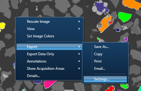 The Export Settings Panel is where you can control all your exporting settings. This Settings Panel is accessed via a right mouse-click on an electron image, X-Ray map, spectrum or Linescan:
