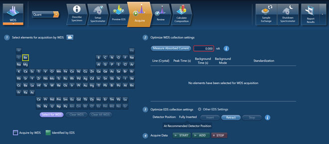 Unique software technology, which uses the EDS input and SEM system information, aids and informs the setup of the WDS acquisition. This inbuilt technology enables AZtecWave to make automatic selections where possible (e.g. of the most appropriate X-ray line, diffracting crystal, background positions) and to give appropriate recommendations for collection settings (e.g. WDS peak and background counting times, EDS insertion position). Feedback is also given in the software, prior to the user pressing start, as to the quality of WDS data that can be expected using the currently selected settings. The helps guarantee excellent results for users of all experience levels, and in the shortest possible times.