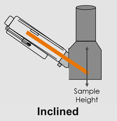 Figure 2. Schematic showing the inclined angle of the Wave spectrometer on an SEM column. The approximate position of the Rowland circle is highlighted in orange and the broadening of the plane of the Rowland circle at the vertically positioned sample is demonstrated (in this orientation the Rowland circle is being viewed from the side).