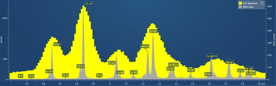 Figure 1. Spectrum collected of closely occurring Rare Earth Element (REE) X-ray peaks from the mineral monazite, showing the higher resolution and peak separation that can be achieved using WDS (grey) in comparison to EDS (yellow).