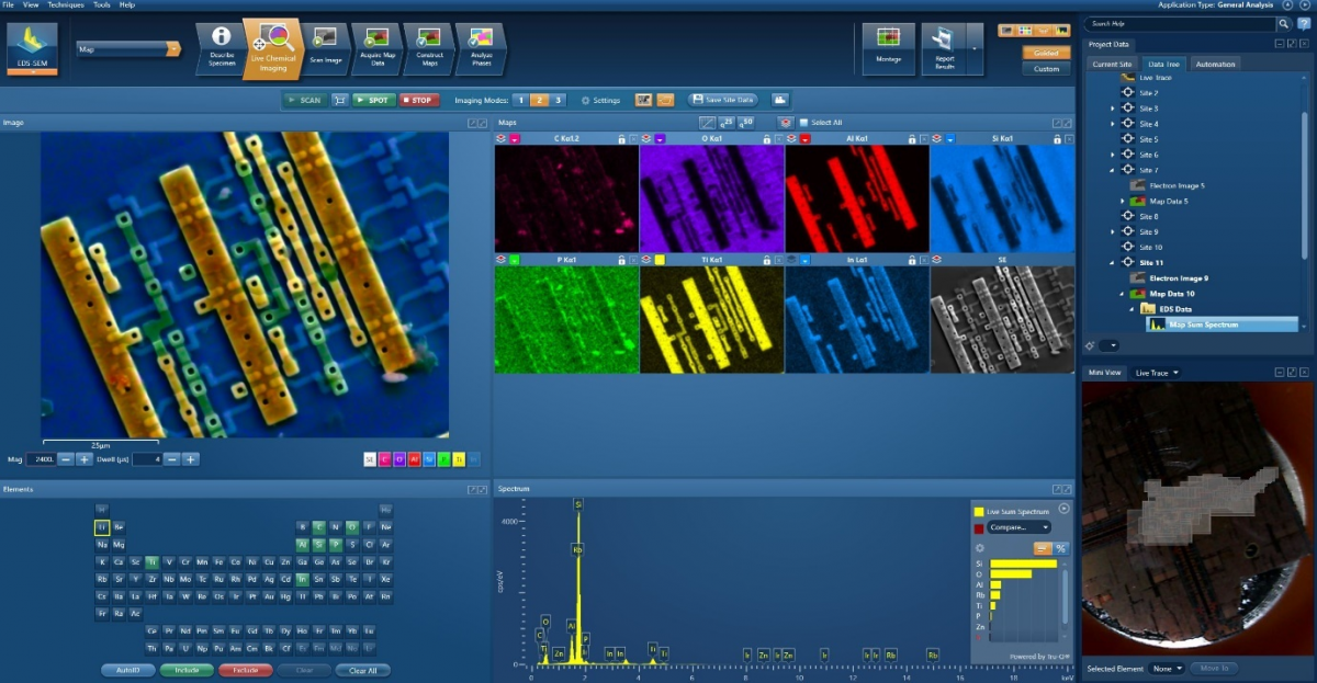In traditional EDS mapping, it is not possible to get chemical information before choosing a site of interest on a sample, but with the introduction of Live Chemical Imaging, that limitation has been overcome. We can now easily investigate the sample by simultaneously acquiring EDS data and electron images while moving the stage. This post will serve as an introduction to the use of live chemical imaging on a semiconductor sample, but if you would like to learn more, please join us for our upcoming webinar "Revolutionise your SEM capabilities with Live Chemical Imaging".