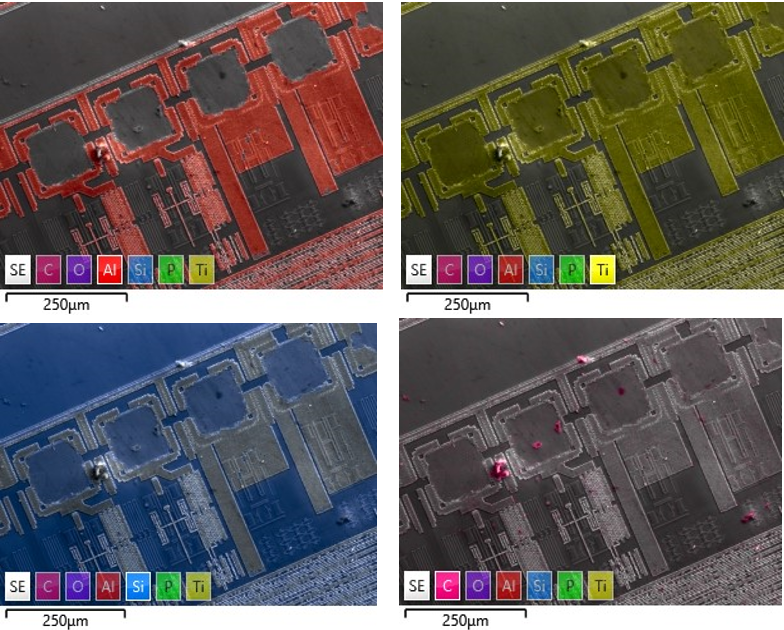 A quick glance in the EDS mapping pane of Live Chemical Imaging reveals that the silicon EDS signal is originating from the chip wafer. It’s clear for the user to see how the oxygen map overlaps with silicon due to the top silicon dioxide layer of the chip which serves as an insulation layer. All interconnects are easily resolved in the aluminium map, and it is possible to conclude that titanium is located underneath the aluminium layer. It’s also clear that certain parts of the circuity are missing their Al coating. A thin layer of Ti is often deposited to help other metals to stick to surfaces, or it can serve as a protective layer to stop Al diffusion into Si layer, even though nowadays it is not that commonly used.