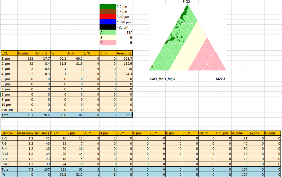 Figure 4: Reporting in Excel for Pirelli Method. a.: Inclusion size distribution tables and ternary plot; b.: % At O-Al-Si-Mg-Ca-S-Mn-Fe of each inclusion; c.: % Wt Al203-CaO-MgO-MnO-SiO2