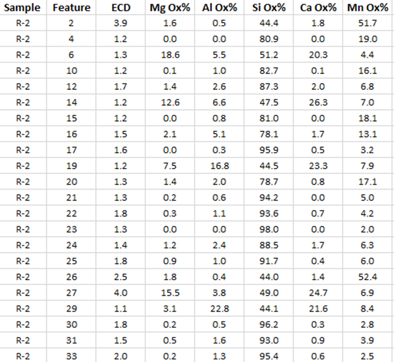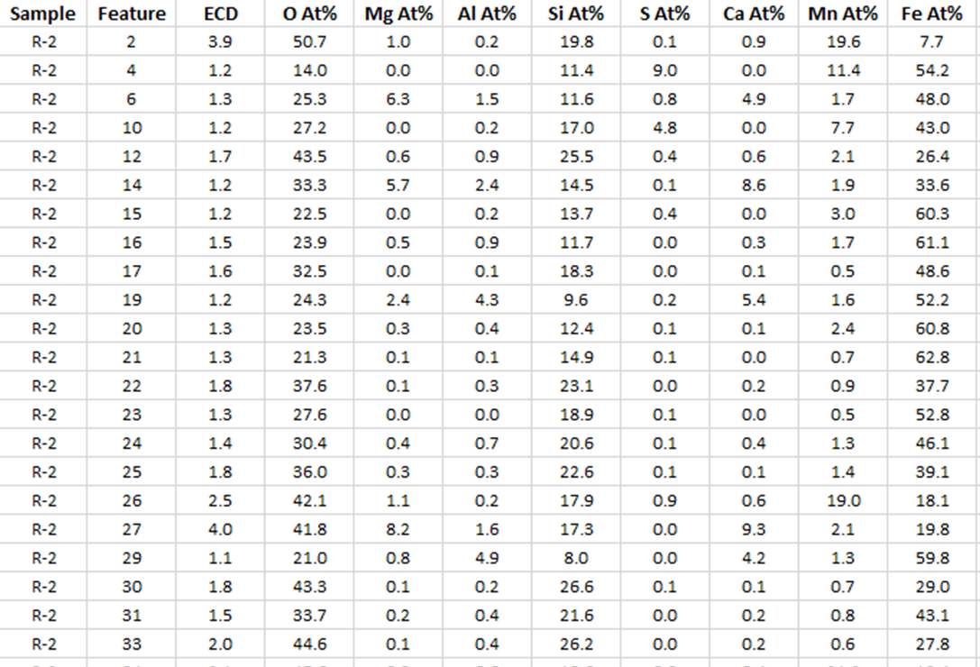 - A qualitative and quantitative analysis (% Wt Al203-CaO-MgO-MnO-SiO2 and % At O-Al-Si-Mg-Ca-S-Mn-Fe) of each inclusion