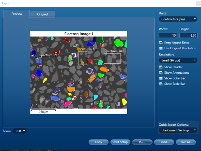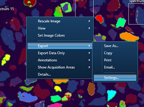 This is where you can control all your ‘Image’ export settings. The Settings Panel is accessed via a ‘right click’ on an electron image, X-ray map, spectrum or linescan. It can be accessed via a right click on and image: