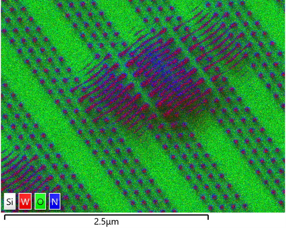 3 kV EDS mapping of a bulk de-layered NAND device using Ultim Extreme. 20 nm features can clearly be seen in the EDS maps and successful peak deconvolution between Si and W is observed.