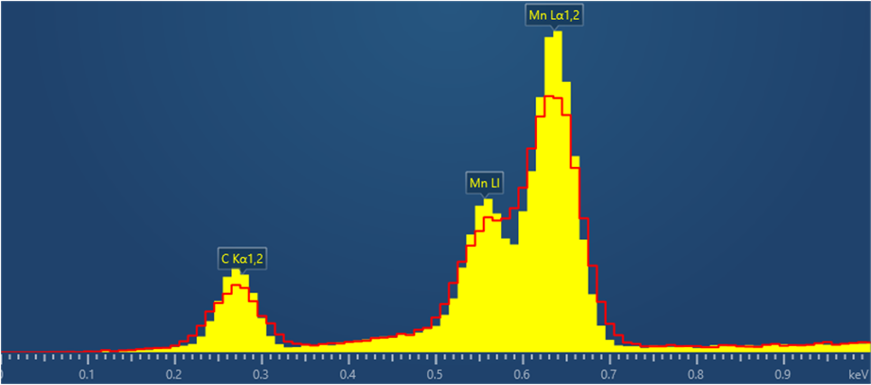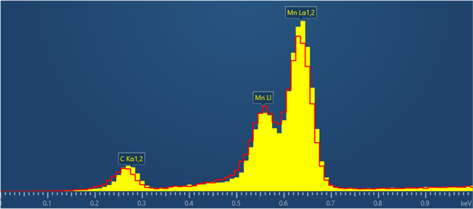 However, the one giving the yellow spectrum has a higher quality front contact with significantly less ICC, than the one giving the red spectrum. This becomes apparent when we look at the low energy part of these spectra, where the yellow spectrum shows better resolution, but more importantly, the carbon peak on the red spectrum is shifted to lower energy. This will cause spectrum processing errors affecting the accuracy of AutoID, mapping etc. In this case the detectors have identical Mn resolution, but low energy resolution differs by 15%, the yellow spectrum has CK resolution 46 eV the red one 52 eV. This is the other important reason for including CK resolution in the standard to measure the performance of an EDS detector.