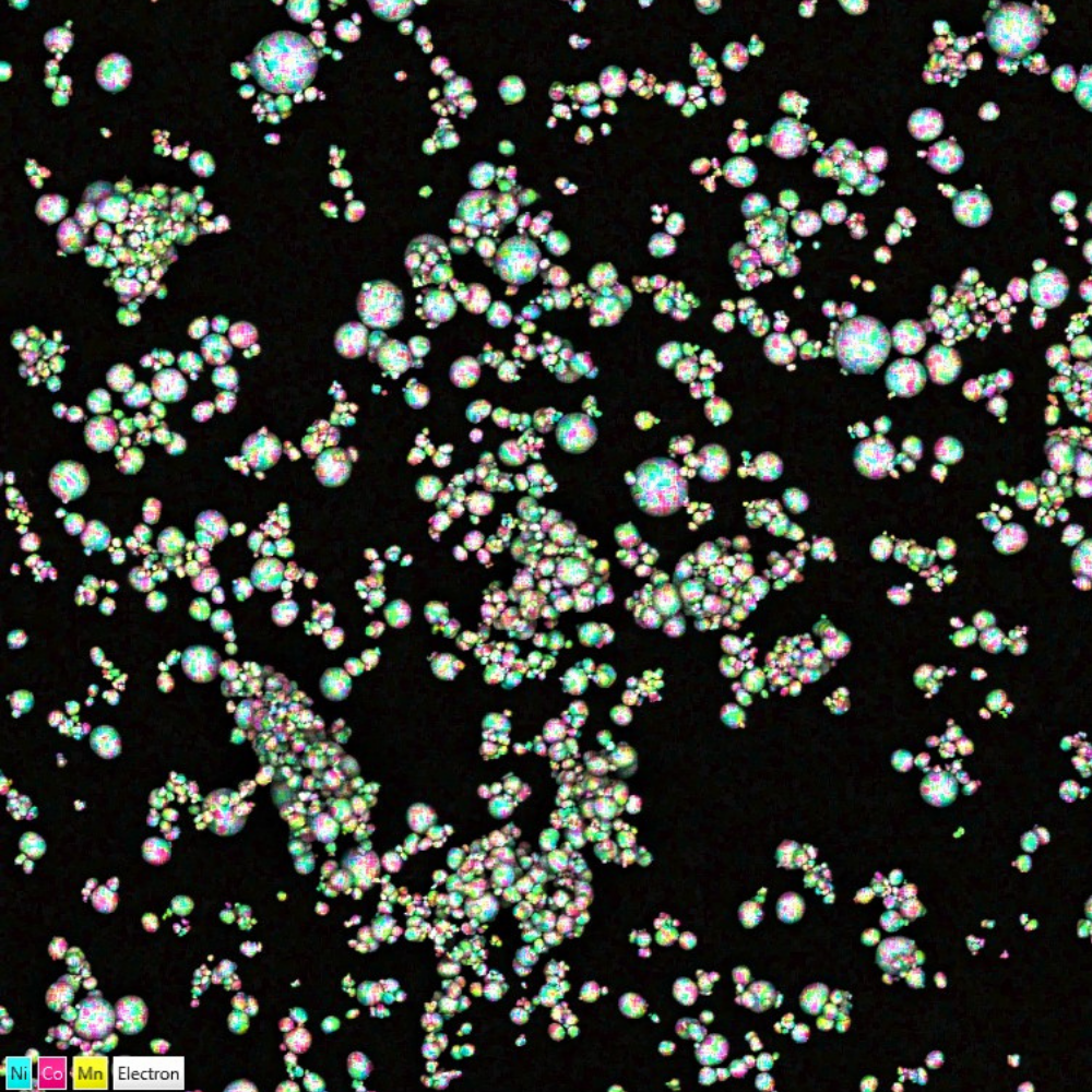 Chemical mapping of NCM particles overlaid on a backscattered electrons image. Fine chemical mapping performed with Ultim Max.