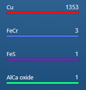 Here we have shown that AZtecAM is a powerful tool for the analysis of all aspects of AM powder samples. Rapid characterisation provides full morphological and chemical details of the individual particles, enabling a quick assessment of the quality of an AM powder batch and instant detection and classification of any impurities or contaminants. In this example, a number of Fe-Cr, Fe-S and Ca-Al-O particles were detected in a gas atomised high-purity copper powder, allowing for an effective assessment of the source of such contaminants.