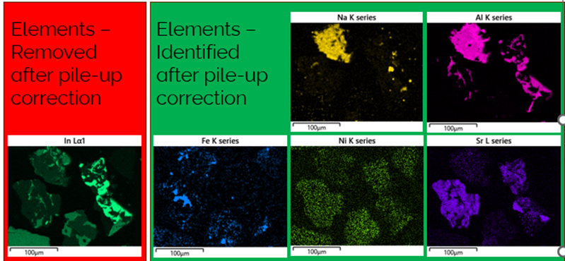 For example, if I want to quickly analyse some mineral samples, I know that I can trust the data in the X-ray maps as well, because each pixel is processed the same way as with the quantification of spectra. In the example in Figure 3, turning on the pile-up correction removes artefacts elements like In and allows previously hidden elements, like Na, Al, Fe, Ni, Sr, to be added even after an extra-quick acquisition of less than a minute.