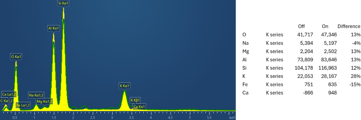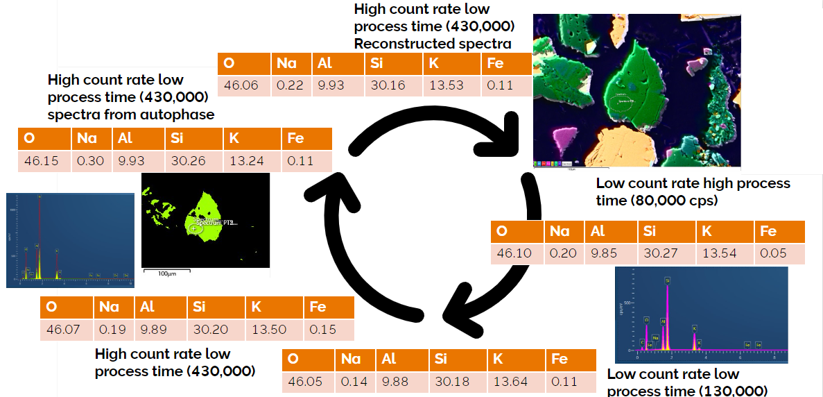 This brings me to my last point, how we can trust data from every step of the acquisition. A few days ago, I was on the microscope with a colleague collecting some data, and we were honestly amazed how the results we obtained were so reliable almost no matter what we were doing. We started with Live Chemical Imaging to find orthoclase grains. Then we collected some low count rate, long process time spectra, and unsurprisingly the quant was great. Then we tried to collect some data with low count rate and short process time - still no problem. We switched over to high count rate, still the results were great. Then we started quickly mapping the grain with high throughput, used the AutoPhaseMap function to segment the map into phases automatically and checked the composition calculated by the spectrum from that orthoclase phase. Lastly, we constructed spectra from the map of that phase (Figure 4). And yes, all the results were reliable and consistent. I felt truly happy and accomplished being able to confirm that all the hard work everyone has put into development these new Infinity EDS detectors can truly give you more.
