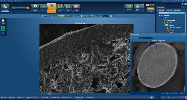One fundamental aspect to any analysis was to be able to see the electron image while moving around a sample. When we found something of interest, we’d stop and acquire EDS data. Within the AZtec software platform we had the components that could help, but because they were never designed with remote working in mind, they were not intimately linked. For example, we had Live Chemical Imaging where we acquire a live electron image, live X-Ray maps and live spectrum. We could also register an image of the sample currently being analysed for stage control. However, prior to COVID, these two functions were not closely/ergonomically linked for remote working.