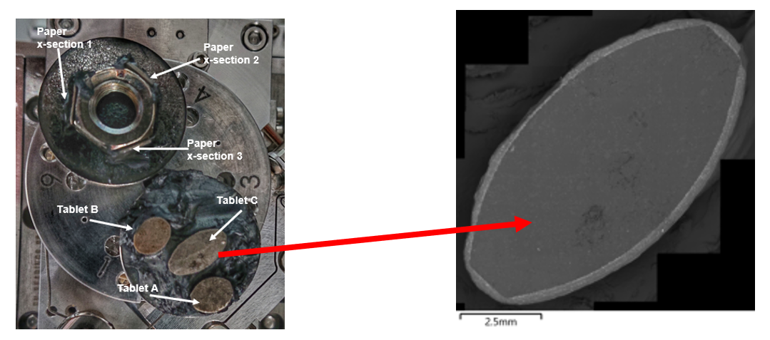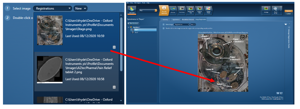 These images can then be imported into and registered in AZtecLive. If any of the samples are small or the registered image requires more detail, the lab manager can take an electron image of the sample and register it. If the sample is relatively big but more detail is required, then a quick Large Area Electron Image can be acquired, and the montaged image will be automatically registered as shown in the example below: