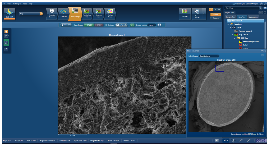 We found the main issue was the continuous switching back and forth between the SEM and the EDS system. The fundamental aspect to any analysis is to see the electron image while moving around a sample and when something of interest is discovered, stop, and acquire EDS data. Within the AZtec software platform we have the components that can help with this, but because they were never designed with remote working in mind, they were not intimately linked. For example, we have Live Chemical Imaging where we acquire a live electron image, live X-Ray maps and live spectrum. We can also register an image of the sample currently being analysed for stage control. However, these two functions were until now not closely/ergonomically linked for remote working.