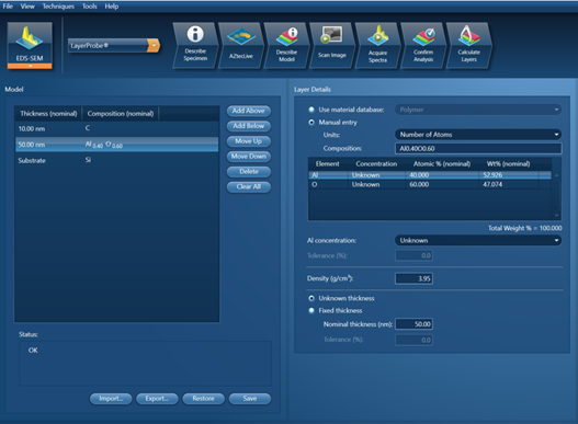Sample preparation – as with normal EDS analysis, for good quantitative compositional analysis (of which LayerProbe is an example), the sample should ideally be flat and conductive. If the sample is not conductive, a conductive coating such as carbon should be applied to stop the sample charging under the electron beam. If a conductive coating is applied, then this should be treated as a separate layer and information on this should be added into the described model (see figure in point 4).