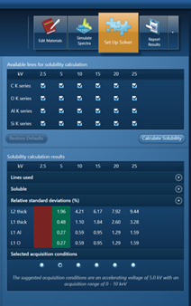 Once the layered model has been described, press ‘Calculate Solubility’ and AZtec will calculate the best accelerating voltage (kV) to use for this particular problem, as shown below.