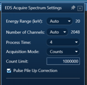 increase the SEM magnification to >1000x, use a process time of 4 or higher, turn the pulse pile-up correction on, and collect an EDS spectrum with a significant number of counts (e.g., 1,000,000) (see below). If this analysis is going to take too long, try increasing the beam current (keeping the deadtime below 50% for the selected process time). Remember if the beam current is changed a new beam calibration measurement will need to be made.