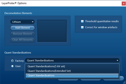 Ensure that the appropriate standard set for the kV used is selected and used for the calculation of the LayerProbe result. For analysis conducted using an acceleration voltage of 5 kV or less use the ‘Quant Standardizations (5 kV set)’, and for 10 kV and over, use the ‘Quant Standardizations’ set (see below). Note, that slightly different element lines will be available with these two standardizations sets.