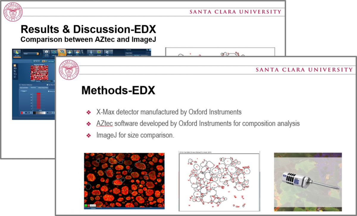 Each student was able to install the software on their personal devices and investigate experimental data obtained from nanoparticles, eutectic SnBi alloys and alpha-brass CuZn alloys without going to the characterization lab in person. They explored the differences between nominal composition, as-acquired data and data corrected by the software as well as compared morphology parameters of the features of interest to the same set of parameters obtained by a different image analysis software; findings and analyses were presented as part of the final exam.