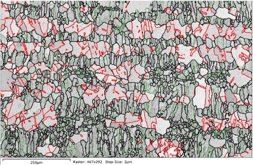 Wang et al2 - EBSD map showing low angle (green), high angle (black) and twin (red) grain boundaries in Cu–15Ni–8Sn alloys.