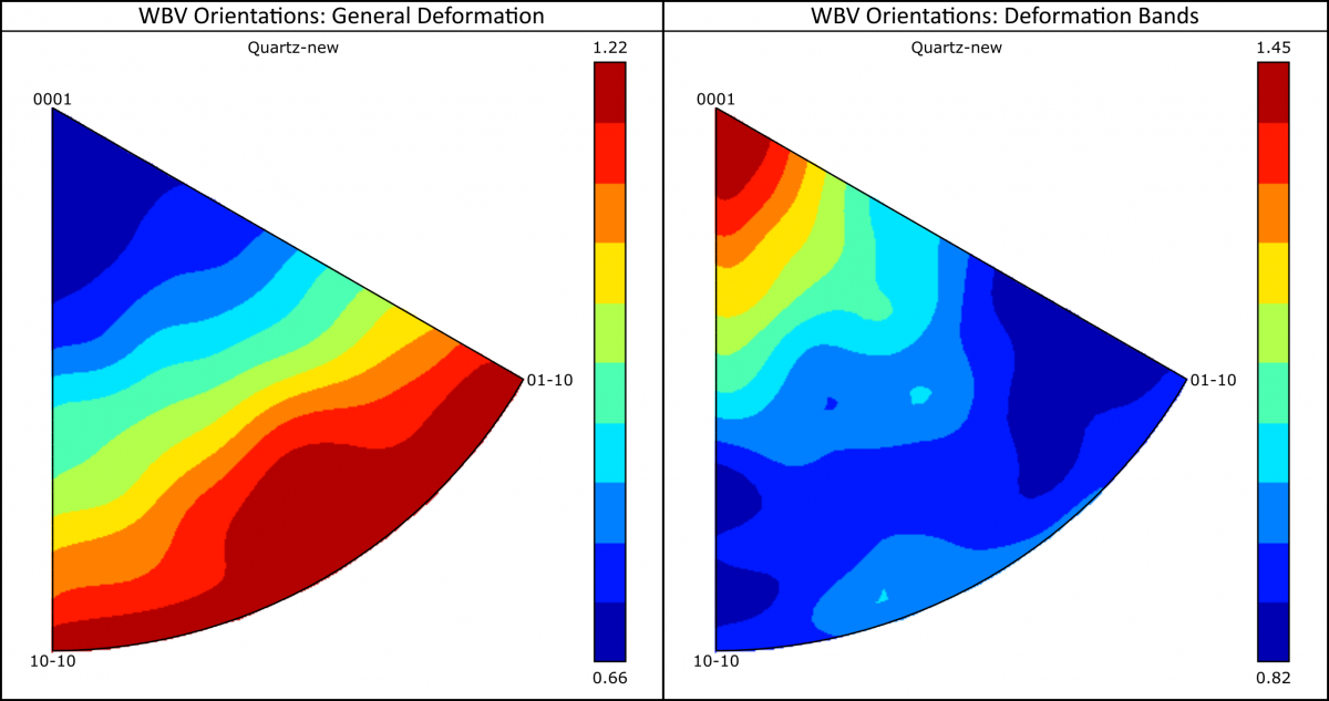 However, when I select just the parallel deformation bands, we see a completely different Burgers vector orientation. Here, the clustering is close to the c-axis, consistent with activation of the less common, high temperature “prism-c” slip system, (10-10)<0001>. From this near-instantaneous result, we can differentiate between the low temperature deformation in this quartz grain and the deformation bands that have almost certainly originated from the high temperature earthquake event itself.