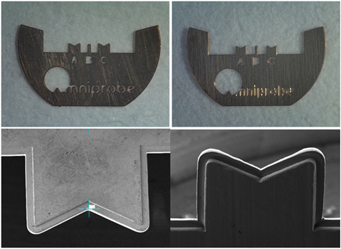 The final grid available is Silicon. Silicon grids are ideal for silicon semiconductor devices, as the grid mills at the same rate of the device matrix and introduces no additional elemental contamination. They are significantly different from traditional OmniGrids. There are 2 main designs, bevelled and shapable fingers. As silicon mills quickly, the finger design is intended to be customised to match your sample and application; atom probe tomography is a good example. The bevel design is angled to match the angle of a conventional undercut. This provides a fast, simple way to attach a sample by multiple points (see advantages of the V-notch). The grids are ~ 100 mm thick, which makes them more rigid compared to metal grids and easier to handle - particularly important for cryo applications. The removal of the fingers on the bevelled grids also benefits cryo, as the deposition used to attach the sample is not shadowed by the grid post.