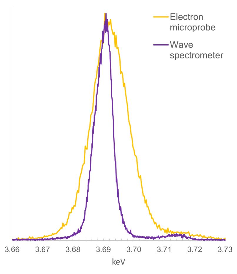 Figure 2 presents a comparison of the Ca Kα peak obtained with the Wave spectrometer, with the same peak obtained using an electron microprobe. As you can see the peak obtained with the Wave spectrometer is much narrower than that obtained with the electron microprobe (FWHM of 7 and 14 eV respectively) – a demonstration of the higher spectral resolution of the Wave spectrometer.