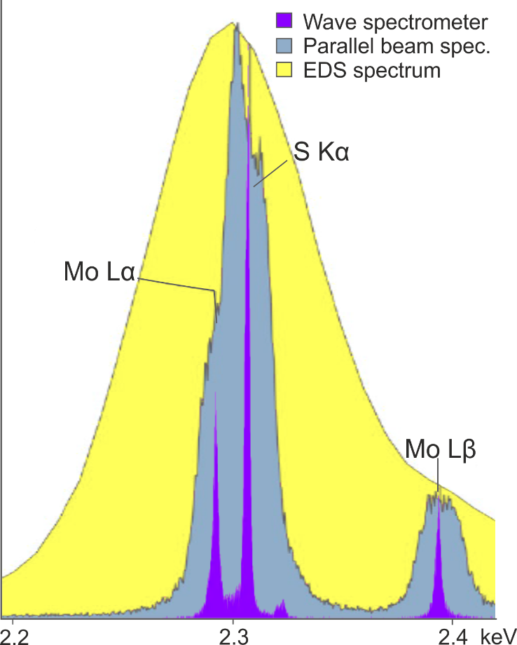 Figure 3. A comparison of the separation of the Mo Lα peak and the S Kα peak achieved using the Oxford Instruments Wave spectrometer, a parallel beam spectrometer, and an EDS detector.