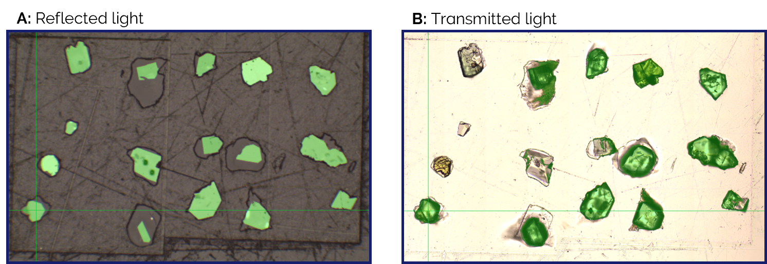 Figure 2: Reflected light image of epoxy resin mounted zircon grains which enables segmentation, but inclusions remain invisible [A]; transmitted light reveals inclusions but prevents reliable zircon segmentation [B], motivating the use of indium-mounted samples. Colour code: green = segmented region.