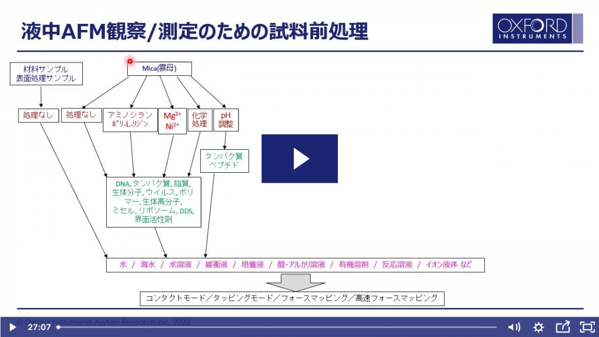 ご好評を頂きました第一回ウェビナー「形状を測るための重要なポイント」に続き、第二回は液中観察・測定のためのポイントを解説致します。いざ液中測定を行おうとした時に躓きやすい点を、経験豊富な弊社アプリケーションサイエンティストのノウハウを交えてご紹介致します。サンプル調整における”試料固定”や”溶媒の調製や屈折率の考慮”、”カンチレバーの選択”など、液中測定ならではの迷いどころに焦点を当てます。当社以外のAFMユーザー様にもご活用頂ける内容となっておりますので是非この機会をご利用ください。