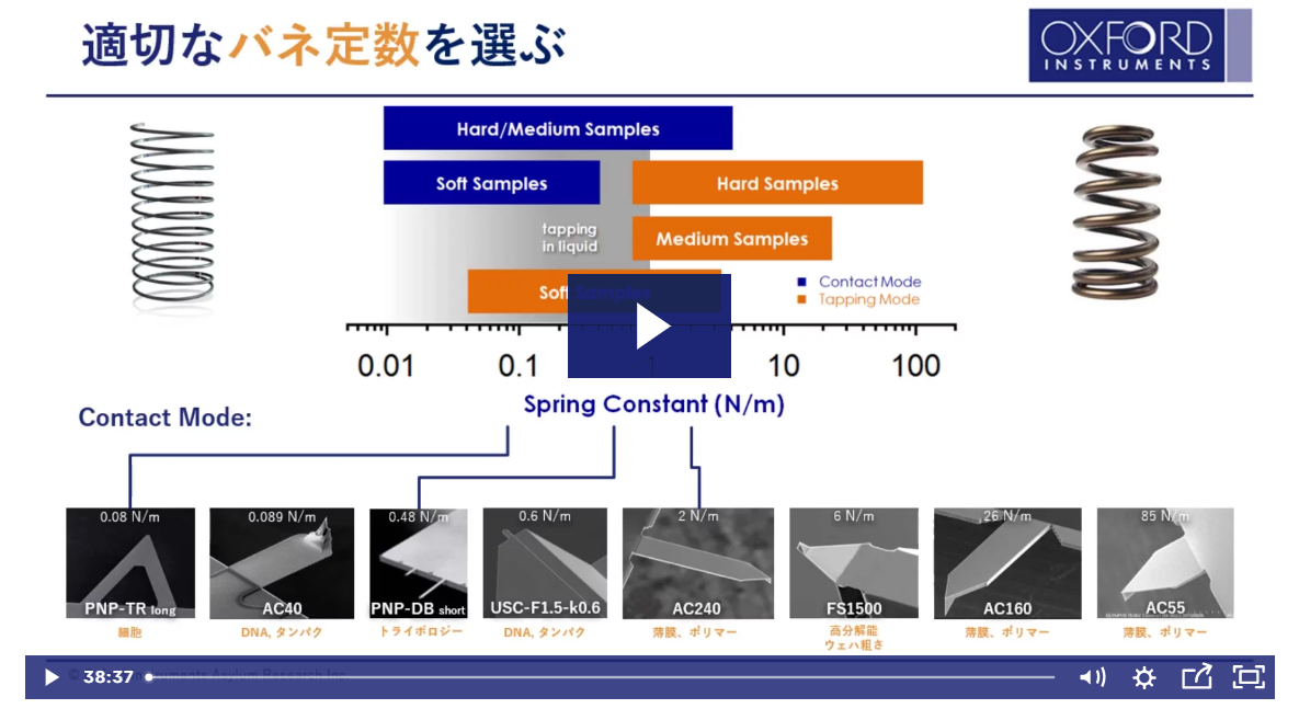 本ウェビナーでは、AFMプローブのバネ定数、共振周波数、探針形状などの特性がどのような意味を持つのか説明します。これらの基本を学んで、測定の目的やお持ちの装置に合ったプローブを選択しましょう。