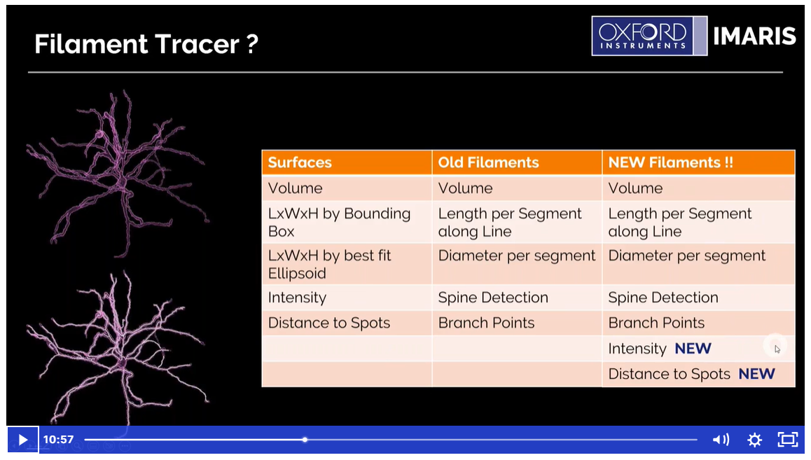 Imaris version 10では、新しいFilament Tracerを用いて長さや太さ、分岐をAIの力を借りて簡単に解析できます。ぜひご覧ください。